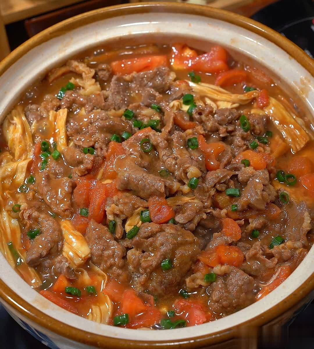 2.砂锅炒香葱蒜末,加番茄丁炒出汁,放生抽、蚝油、盐调味,倒清水,放腐竹、金针菇煮3分钟,铺牛肉再煮2分钟,撒葱花。